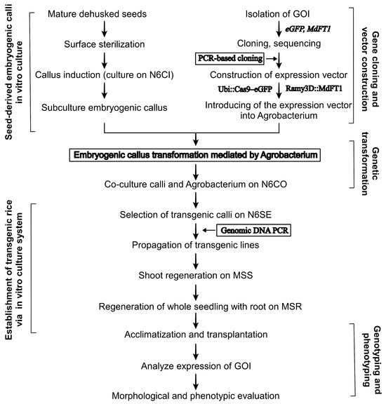 In this study, we present a clear step-by-step guide, that not only provides a protocol on plant tissues’ in vitro culture systems but also on how to establish transgenic plants for the functional study of GOI in the field of genetic engineering (Figure 9). We meticulously documented the entire plant transformation process, from the cultivation of seed-derived embryogenic calli to the cloning of target genes into binary expression vectors and the generation of fully transformed plants. This was followed by comprehensive genetic and phenotypic analyses of the transgenic plants to confirm the success of the transformation. The expression of target genes in transgenic rice has been shown to be stable and heritable. Overall, we developed an efficient Agrobacterium-mediated genetic transformation method to obtain transgenic rice plants. The development of genetic transformation systems offers critical tools for functional analysis of GOI, exploring molecular mechanisms behind key traits, and creating genetically modified crops with enhanced traits.