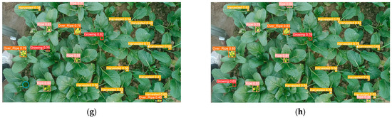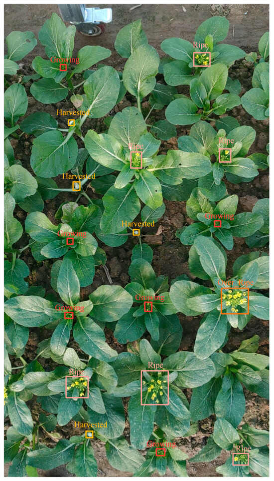 The dataset utilized in this study was procured from a field of flowering Chinese cabbage in its natural environment. The images were captured between October and November 2023 at South China Agricultural University in Guangzhou City, Guangdong Province, China, utilizing a specifically designed data acquisition platform with adjustable height. A mobile phone camera, specifically the OPPO Find X2 (OPPO Find X2 is from OPPO Guangdong Mobile Communications Co., Ltd., Dongguan, Guangdong, China) with a resolution of 3840 × 2160, was used for image capture, complemented by an Intel D435i depth camera for select research components. The camera, positioned at a height of 0.8 to 1 m from the plant canopy, was mounted on the platform and moved at a constant speed of approximately 0.15 m/s. The dataset comprised 1016 images, encompassing 11,970 target samples of flowering Chinese cabbage, capturing various stages from germination to flowering and maturity. The data collection spanned different time periods, including mornings and afternoons, under varying light conditions ranging from soft early morning light to intense midday sun and slanting evening light, to ensure the diversity of experimental data. The dataset was labeled and randomly divided into training, validation and test sets in a 7:2:1 ratio. The specific number of data samples is presented in Table 4, and an illustration of the data types is provided in Figure 7. To guarantee the training generalization and efficiency of the model, the image resolution of the training set was uniformly adjusted to 640 × 640.