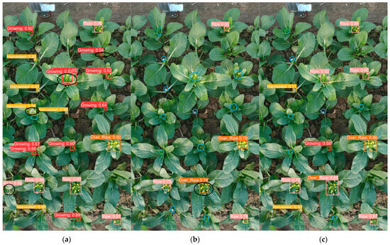 In contrast, SSD enhances the precision of detection by integrating the predictive outcomes of diverse feature maps with varying resolutions, thereby enabling the model to more accurately align targets with the diverse shapes and sizes of flowering Chinese cabbage. However, in comparison to the two-stage detection approach, the recall rate of SSD exhibits a notable decline, leading to a comparatively low mAP50 of 75.7% among all evaluated models.