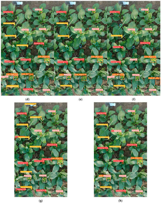 Figure 2 illustrates the performance of various models in detecting outcomes under a sunlit environment. The blue circle denotes the area where a detection was missed, while the black circle represents the region where a false detection occurred. Of the models evaluated, YOLOv8-Improved demonstrated the most optimal detection performance, as illustrated in Figure 2h, exhibiting a minimal number of missed detections and false positives. As shown in Figure 2d, YOLOv5 also demonstrated satisfactory detection performance, albeit with a slight increase in the number of false detected targets in comparison to YOLOv8-Improved. As seen in Figure 2b–f, respectively, one-stage detection models, SSD, RetinaNet, YOLOv5, YOLOv8 and YOLOv9, exhibited a tendency to miss certain regions, with SSD demonstrating the greatest propensity for this phenomenon. Additionally, the detected targets often correspond to anchor frame sizes that are incongruent with the actual dimensions of the objects in question. In comparison, Faster R-CNN as a two-stage detection model, as shown in Figure 2a, exhibits a lower miss rate than the one-stage models, yet it also displays a slight proclivity for false detection targets.