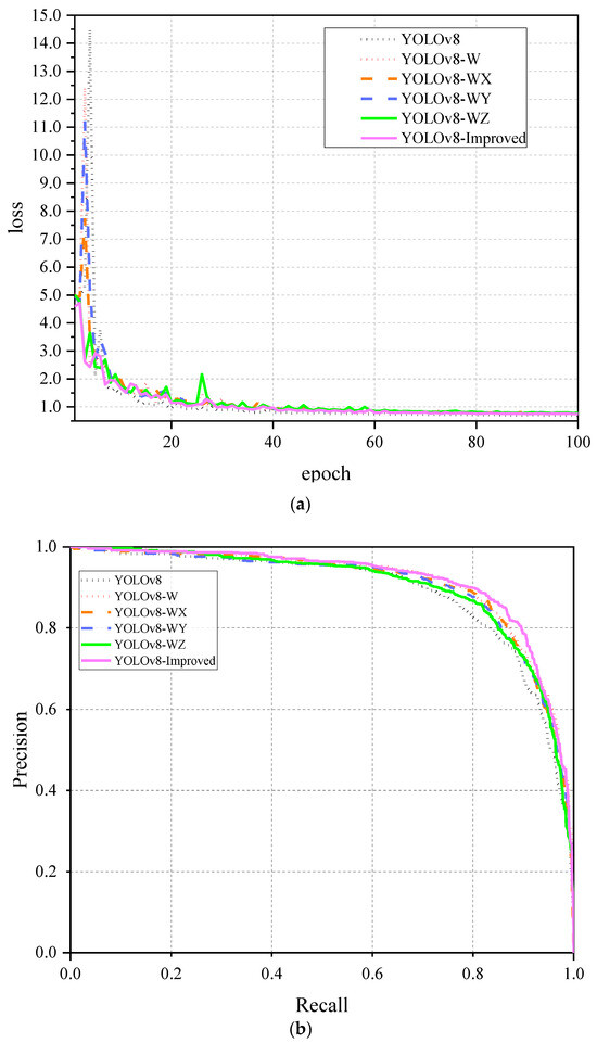 Ablation experiments: (a) Loss curve; (b) Precision-recall curve.