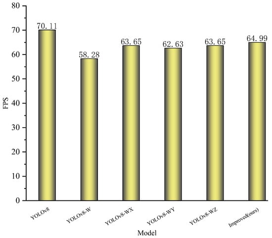 When a small object detection layer was added to the model, the mAP50 improved by 1.2%. After incorporating the MLCA mechanism with the C2F module into the base model, the mAP50 increased by 1.8%. The inclusion of the attention mechanism effectively enhanced the feature extraction ability of the network and suppressed the interference of useless information. The mAP50 increased by 2.5% after replacing PAN as a neck network with BiFPN. Replacing CIoU with Wise-Inner-IoU increased the mAP50 by 1.4% at this point. Finally, the best performance was exhibited after combining the small object detection layer, C2F-MLCA, BiFPN and Wise-Inner-IoU. As a result, Params was reduced by 25.34%, while precision, recall, mAP50 and mAP75 improved by 1.6%, 2.7%, 2.9% and 4.7%, respectively. Figure 4a shows the loss curve on the training set, while Figure 4b shows the P-R curve on the validation set. This observation suggests that the combination of MLCA, BiFPN and Wise-inner-IoU effectively reduces the loss values and enhances the detection performance. The FPS data of each model in the ablation experiments are shown in Figure 5; due to the increase in the computation and the slowing down of the inference speed, the YOLOv8-Improved model experiences a minor reduction in FPS when compared to the baseline model. This decrement, however, remains within an acceptable threshold for a real-time detection model capable of processing over 60 frames per second.