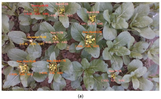 As illustrated in Figure 6, the system demonstrated the capacity to accurately identify flowering Chinese cabbage at varying degrees of maturity, concurrently providing precise coordinates of every detected target in the coordinate system of the camera. The implementation of this functionality facilitates a more comprehensive analysis of the growth status of flowering Chinese cabbage in three-dimensional space, thereby providing robust technical support for precision agriculture management. By comparing the spatial distribution and growth trend of flowering Chinese cabbage at different maturity levels, agricultural management can develop a more scientific picking plan and enhance the efficiency of agricultural production.