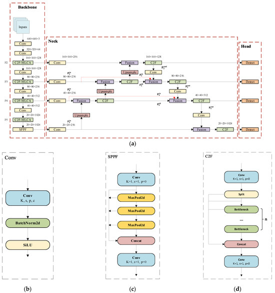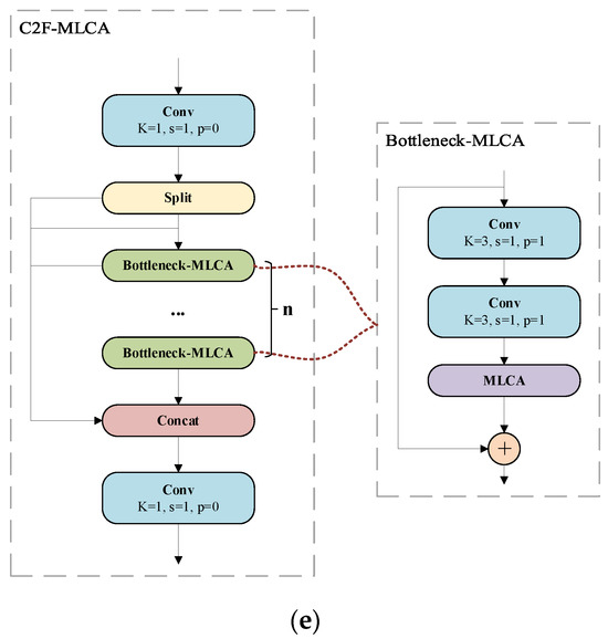 YOLOv8-Improved network architecture and modules: (a) YOLOv8-Improved; (b) Conv; (c) SPPF; (d) C2F-MLCA; (e) C2F.