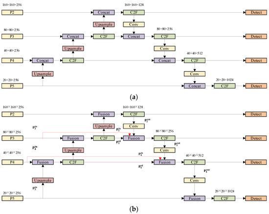 To optimize the target detection architecture, we augment the existing P3, P4 and P5 detection layers with a P2 layer. The P2 layer has a narrow receptive field and is specialized for recognizing small target objects. When integrated with the BiFPN neck, it enables seamless bidirectional feature data exchange between layers. This multi-scale feature fusion technique enhances the network’s ability to localize small targets because the relevant features are prominently located in lower-level, high-resolution maps. The addition of P2 enhances the BiFPN’s ability to merge multiple levels of features, allowing the network to better integrate details from lower levels and abstract semantics from higher levels. In particular, the bidirectional information flow within the BiFPN ensures comprehensive contextual evaluation during feature integration, which is important for distinguishing visually similar targets. BiFPN employs a weighted feature fusion mechanism to integrate features of disparate levels. During the training process, the fused weights are learned, thereby ensuring optimal feature integration [34]. The structure of this feature fusion network is shown in Figure 9b. The majority of neck networks employ a straightforward aggregation approach for the integration of disparate input features, lacking any form of differentiation. However, this results in an uneven contribution to the fused output features, due to the inherent differences in resolution between the input features. In BiFPN, the input to the neck is given a multi-scale feature list , where denotes the features of the layer. The BiFPN transformation aggregates disparate features to produce a new feature list as output.