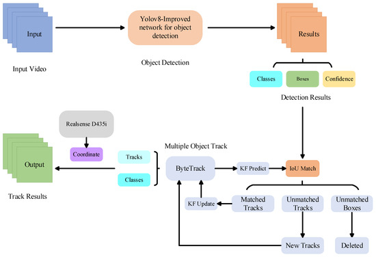 In the context of monitoring Chinese flowering cabbages, ByteTrack, a detection-based tracking (DBT) algorithm, is employed to generate tracks corresponding to individual cabbages. These tracks are subsequently matched frame-by-frame with the detection results produced by the YOLOv8-Improved model, enabling effective object tracking. The overall workflow of the model is depicted in Figure 12. In this context, the term “tracks” refers to the data representing the trajectories of objects. The ByteTrack algorithm categorizes the detection boxes generated by the YOLOv8-Improved model into two distinct categories: high-score boxes and low-score boxes. These categories are determined based on the confidence scores associated with each box. Additionally, ByteTrack divides the tracks into two types: long-term tracks and short-term tracks. Subsequently, the long-term tracks are matched with the high-score boxes, which have been identified through the application of the Kalman filter [40]. A successful match results in an immediate update of the position, whereas a failed match leads to the subsequent matching with low-score boxes.
