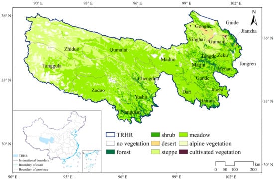 - Zhang, X.; Jin, X. Vegetation dynamics and responses to climate change and anthropogenic activities in the Three-River Headwaters Region, China. Ecol. Indic. 2021, 131, 108223. [Google Scholar] [CrossRef]