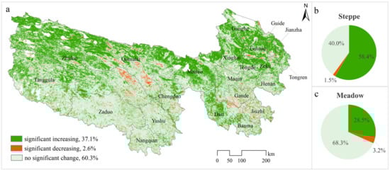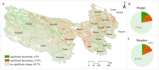 The linear trend in NDVI from 2000 to 2022 in TRHR. ((a) Spatial distribution of significant increase, decrease, and no significant change; (b,c) the respective proportions within steppe and meadow regions).