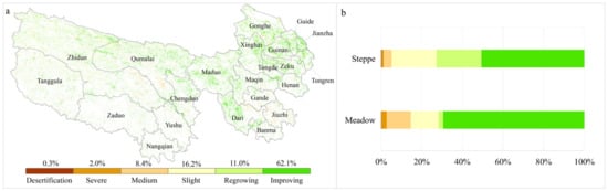 Further analysis was conducted in terms of different grassland types. The results showed that in contrast to steppes, meadows exhibit a higher proportion of areas with improved conditions and also contain areas where only medium degradation occurred; the specific figures are 50.7% vs. 69.4% (improving conditions) and 4.0% vs. 11.9% (medium degradation), respectively. Conversely, the proportions of areas with regrowing conditions and slight degradation in steppes are both higher than that in meadows; the figures are 22.1% vs. 2.3% (regrowing) and 21.9% vs. 13.5% (slight degradation), respectively (Figure 4b).