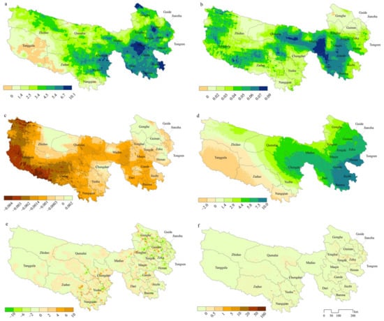 The slopes of variations in distinct driving factors are depicted in Figure 5. Over the past two decades, the TRHR has exhibited a pronounced trend towards a warmer and more humid climate. The statistical significance of linear trends indicates that an overwhelming majority of the regions (99.9%) have experienced an increase in average annual temperature, with 78.5% of these regions demonstrating a statistically significant rise (Figure 5b and Figure 6). In terms of annual precipitation, a substantial majority of the regions (93.7%) had an upward trend, with 28.5% of these regions showing a significant increase, predominantly in the southeastern and northwestern sectors of the study area (Figure 5a and Figure 6). Conversely, a significant proportion of the regions (85.3%) have observed a decline in Relative Humidity (RH), with 22.2% of these regions experiencing a statistically significant decrease, primarily in the western part of the study area (Figure 5c and Figure 6). Furthermore, SPEI has shown an upward trend in 74.6% of the regions, with 24.2% of these regions indicating a statistically significant increase, signifying enhanced humidity in the aforementioned areas (Figure 5d and Figure 6). The overall intensity of human activities within the study area has remained relatively stable with a modest decline. Specifically, regions with unchanged and decreasing population density account for 38.9% and 50.5%, respectively, while only 10.6% of the regions have experienced an increase in population density (Figure 5f and Figure 6). Grazing intensity has remained unchanged or decreased in 21.3% and 48.5% of the regions, respectively, with an increase observed in 30.2% of the regions, predominantly in counties where vegetation degradation is concentrated, such as Qumalai, Chengduo, Yushu, Tanggula, Zaduo, Nangqian, Gade, and Jiuzhi (Figure 5e and Figure 6).