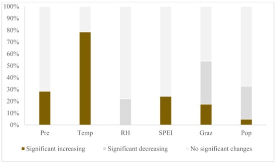 Proportional distribution of variations in different driving factors (%) (Pre, Temp, RH, SPEI, Graz, Pop represent annual precipitation, average temperature, relative humidity, Standardized Precipitation Evapotranspiration Index-12, grazing intensity, and population density, respectively).