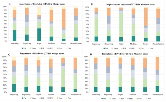 The importance of influencing factors on NDVI and its spatial heterogeneity within different types of significant change areas. ((A,B) the importance of factors affecting NDVI in steppe and meadow areas, respectively; (C,D) the importance of factors affecting spatial heterogeneity in these areas).
