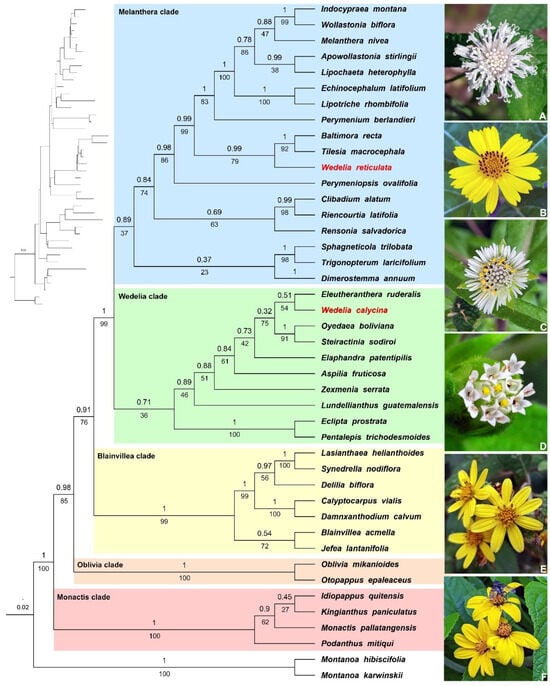 Molecular phylogeny of Ecliptinae, highlighting the five informal clades proposed here: right tree shows posterior probabilities of the Bayesian inference shown above branches and bootstrap values shown below branches, and left tree shows branch lengths. (A). Melanthera nivea (L.) Small by Katie Z, (B). Wedelia calycina Rich. by Juan Gabriel, (C). Eclipta prostrata (L.) by Nana Ten, (D). Blainvillea gayana Cass. by Frederico Acaz Sonntag, (E). Otopappus verbesinoides Benth. by Luis Humberto Vicente-Rivera, and (F). Kingianthus paniculatus (Turcz.) H.Rob. by Yanna Paola.