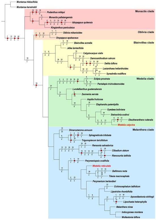 The five main clades of Ecliptinae recovered in this study have consistently been recovered by all previous molecular phylogenetic studies on Heliantheae [6,10,12,13,14]. Additionally, the morphological traits used by Panero [3] in the last taxonomic treatment for this subtribe were recovered as homoplasies and synapomorphies supporting Ecliptinae, Oblivia, Blainvillea, and Eclipta clades. Our results show that the generic circumscriptions in Ecliptinae are affected mainly by the non-monophyly of two genera, Melanthera (six species) and Wedelia (131 species). Edwards et al. [14] showed that Melanthera latifolia (Gardner) Cabrera was recovered as a sister to Lipotriche in their analyses, making Melanthera paraphyletic. To solve this matter, these authors formally proposed the reestablishment of Echinocephalum Gardner. In our results, Wedelia calycina Rich. (i.e., Wedelia s.s.) was placed in the Wedelia clade alongside several genera with neuter ray florets, such as Aspilia, Elaphandra, Eleutheranthera, Oyedaea, and Steiractinia. However, Wedelia reticulata DC. was recovered in the Melanthera clade, which corroborates evidence from previous studies on Ecliptinae [12,14] that indicate Wedelia is paraphyletic.