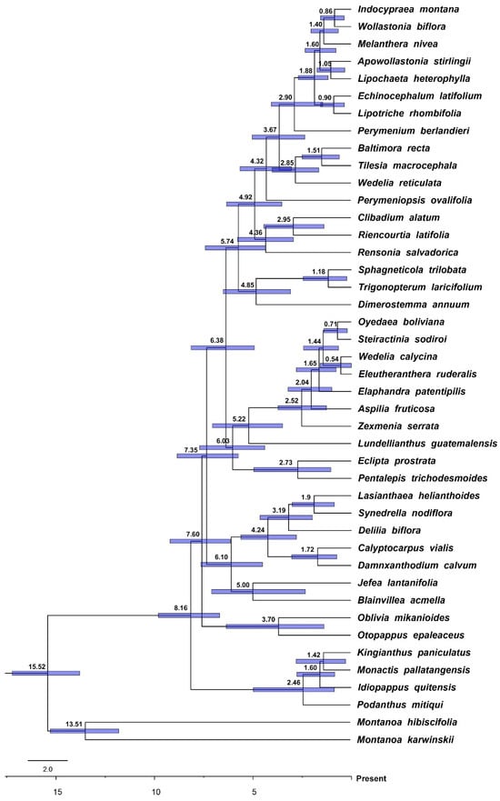 Moraes et al. [12] sampled two nuclear markers (ETS and ITS) for 34 genera of Ecliptinae, recovering the same four clades from their previous study using just plastid markers. Ren [13] sampled ten plastid (5′trnK intron, matK gene, trnT-trnL spacer, trnL intron, trnL-F spacer, rbcL-accD spacer, psbH-petB spacer, petB intron, petB-petD spacer, and petD intron) markers and 33 genera of Ecliptinae to propose a new genus, Indocypraea Orchard, segregated from Wollastonia DC. ex Decne. This author recovered the clades Monactis, Oblivia, Blainvillea, and Eclipta as monophyletic but failed to sample any members of the Melanthera clade. Finally, Edwards et al. [14] sampled two nuclear (ETS and ITS) and two plastid (psbA-trnH and trnQ-rps16) markers for 19 genera of Ecliptinae but focused on the Melanthera clade (referenced by them as the Melanthera alliance). These authors aimed to test the generic boundaries and biogeographic hypotheses in the lineages of this clade, but a biogeographic analysis remained elusive due to the lack of a dated and calibrated phylogeny and ancestral range estimates.