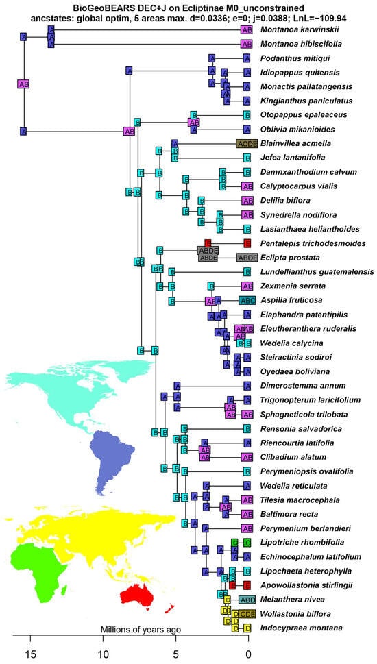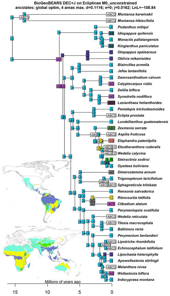 Species distribution data were compiled from POWO [11] and herbarium collections from specimens in the Global Biodiversity Information Facility (GBIF) [31]. Ancestral range reconstructions were defined for the continents (A—South America, B—North America, C—Africa, D—Asia, E—Oceania) and biomes (A—Dry forests, B—Altitudinal grasslands, C—Savannas, D—Rainforests). Ancestral ranges of Ecliptinae were estimated using the R package BioGeoBEARS version 1.1.1 [32] and the models DEC, DIVALIKE, and BAYAREALIKE. Considering the possibility of underestimation of extinction rates due to the null ranges of the species allowed by the models, analyses with the “*” option were also performed. The “j” option was used to consider founder speciation events. Different combinations of the three models and the two options generated a total of 12 models. The best-fitting models for analyses were determined by AIC weight ratios.