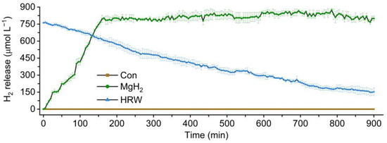 Comparison of H2 contents in HRW and hydrolyzed MgH2 solution. The means and ± SD values were obtained from three independent experiments with three biological replicates for each.
