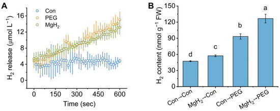 To explore the potential link between osmotic stress, MgH2, and endogenous H2 metabolism in plants, we investigated the endogenous H2 release using a H2-specific electrode (Figure 3A). After treatment with PEG or MgH2, the endogenous H2 release was both rapidly and significantly triggered in the roots of mung bean seedlings in comparison with Con. Subsequently, after pretreatment with or without MgH2 and then exposure to either control conditions or polyethylene glycol (PEG)-6000, the endogenous H2 content was analyzed using gas chromatography (GC). As shown in Figure 3B, osmotic stress significantly induced H2 production in comparison with the control samples. In addition, the H2 content was increased by about 21.28% in the samples pretreated with MgH2 only. Under osmotic stress, MgH2 further elevated the H2 content by about 35.70%.