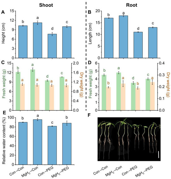 MgH2-induced osmotic tolerance. After germinating for 2 days, mung bean seedlings were pretreated with or without 0.01 g L−1 of MgH2 for 12 h. Subsequently, seedlings were maintained in control conditions (Con) or exposed to osmotic stress (20% PEG) for 3 days. The shoot height (A), root length (B), FW and DW of 30 shoots (C) and 30 roots (D), and relative water content (E) were detected. (F) Representative phenotypes are shown. Scale bar = 5 cm. The means and ± SD values were obtained from three independent experiments with three biological replicates for each. The different letters indicate significantly different values (p < 0.05) according to Tukey’s multiple range test.