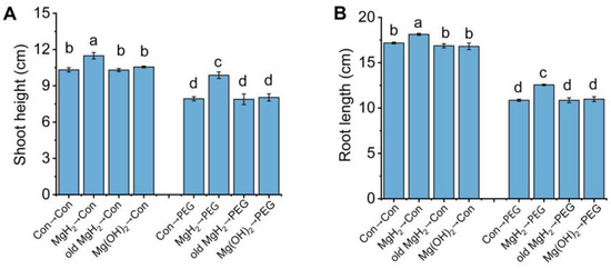 MgH2-conferred osmotic tolerance is likely H2-dependent. Germinated mung bean seedlings were pretreated with 0.38 mM fresh MgH2 (0.01 g L−1), old MgH2 (losing the ability to release H2), or 0.38 mM Mg(OH)2 (22.17 g L−1) (main by-product of MgH2 hydrolysis) for 12 h. The root length (A) and shoot height (B) were subsequently measured. The means and ± SD values were obtained from three independent experiments with three biological replicates for each. The different letters indicate significantly different values (p < 0.05) according to Tukey’s multiple range test.