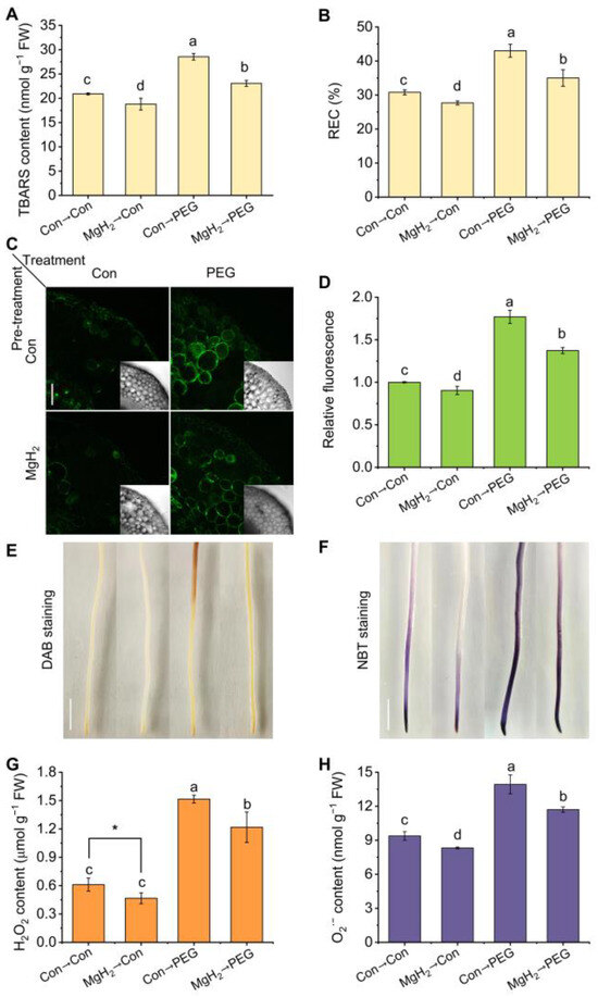 Furthermore, the H2O2 and O2·− levels in the roots were visualized using diaminobenzidine (DAB) and nitroblue tetrazolium (NBT) staining, respectively. The results show that H2O2 (Figure 6E) and O2·− (Figure 6F) rapidly accumulated in the roots of stressed seedlings, but this accumulation was prevented after MgH2 pretreatment. Similar results were obtained for the H2O2 (Figure 6G) and O2·− contents (Figure 6H).