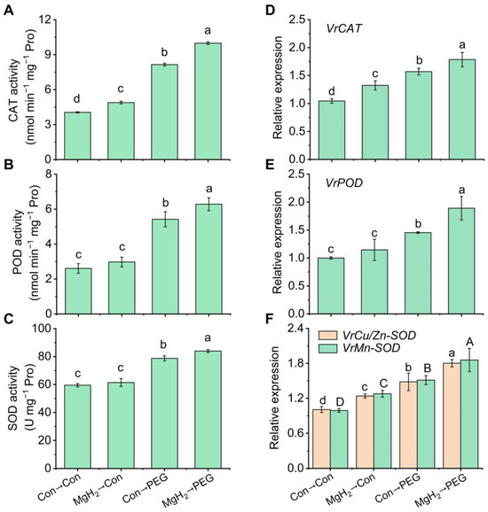 The activities and transcriptional levels of antioxidant enzymes were modulated by MgH2 under osmotic stress. After different treatments for 2 days, the activities of CAT (A), POD (B), and SOD (C) in roots were assessed. Following different treatments for 1 day, the corresponding transcriptional levels of VrCAT (D), VrPOD (E), and VrCu/Zn-SOD and VrMn-SOD (F) were analyzed. The means and ± SD values were obtained from three independent experiments with three biological replicates for each. The different letters indicate significantly different values (p < 0.05) according to Tukey’s multiple range test.