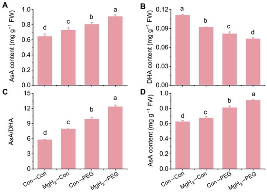 To investigate the potential regulation by MgH2 of non-enzymatic pathways, the AsA and GSH accumulation were studied. Exposure to osmotic stress elevated the AsA content in the roots of mung bean seedlings (Figure 8A). Pretreatment with MgH2 resulted in a significant enhancement in the AsA content under PEG treatment. In contrast, the osmotic stress-decreased dehydroascorbate (DHA, the oxidized form of AsA) content was further reduced by MgH2 (Figure 8B). Compared with stress conditions, the ratio of AsA/DHA was further increased after MgH2 pretreatment (Figure 8C). Consistently, similar results for the AsA content in the roots were further confirmed by high-performance liquid chromatography (HPLC) (Figure 8D).