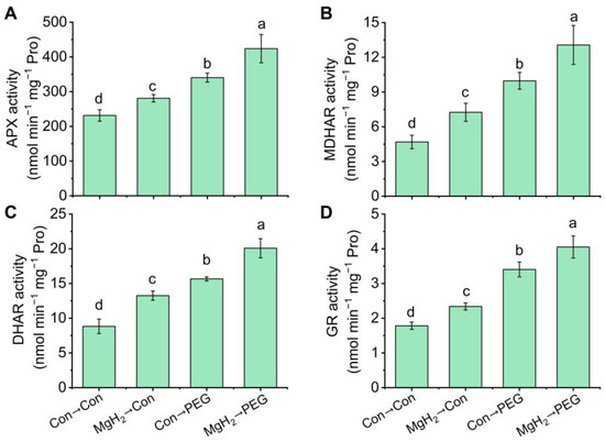 In order to further verify the above responses, the potential causal link between MgH2 and key enzymes involved in the AsA-GSH cycle was investigated. The activities of key enzymes, including APX (Figure 10A), MDHAR (Figure 10B), DHAR (Figure 10C), and GR (Figure 10D), were all increased by osmotic stress. The application of MgH2 further enhanced the activities of APX, DHAR, MDHAR, and GR by 24.54%, 28.02%, 31.09%, and 19.12%, respectively.