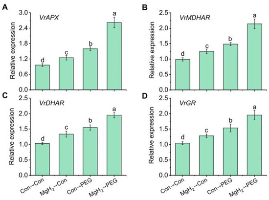 The transcriptional levels of key genes involved in the AsA-GSH cycle regulated by MgH2 under osmotic stress. After different treatments for 1 day, the transcriptional levels of VrAPX (A), VrMDHAR (B), VrDHAR (C), and VrGR (D) in roots were analyzed. The means and ± SD values were obtained from three independent experiments with three biological replicates for each. The different letters indicate significantly different values (p < 0.05) according to Tukey’s multiple range test.