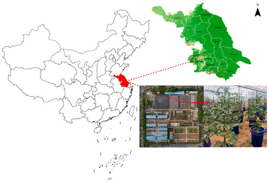 The greenhouse pot experiments were conducted during 2022 and 2023 at Water-saving Park (E118°46′56″, N31°54′49″) at Hohai University, Nanjing, Jiangsu Province, China. The geographical location of the experimental site is shown in Figure 1. The experimental site has a subtropical monsoon humid climate with an annual average temperature of 15.7 °C. It has a 237-day frost-free period and 2017.2 h of sunshine.