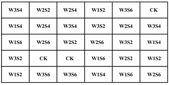Pot experiments were used to study the effects of different drought hardening intensity and salinity level combinations on the benefits of high-yield, high-quality, and water-saving multi-objective demands in tomatoes. Water control started 15 days after tomato transplanting and stopped at the end of the seedling stage. Three irrigation levels were set: W1 (sufficient irrigation, irrigation limit of 85% of the field water-holding capacity (FC)), W2 (mild deficit irrigation, irrigation limit of 70% FC), and W3 (heavy deficit irrigation, irrigation limit of 55% FC). Different concentrations of salty water were used to irrigate the tomatoes from the flowering and fruiting stage to the end of harvest. Three salinity levels were set: 2 g/L (S2), 4 g/L (S4), and 6 g/L (S6). In addition, the combination of no drought hardening and no salty water irrigation was set as the control treatment (CK). Therefore, experiments were finally set up with 10 treatments and 3 replicates for each treatment. The experiments were conducted in a completely random experimental design (Figure 2). The specific experimental program is shown in Table 1.