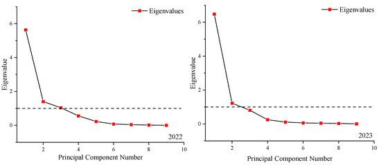 The scree plot in 2022 and 2023. Note: the horizontal axis represents the serial number of principal components. The vertical axis represents the eigenvalue corresponding to the principal component calculated from the principal component analysis. The dotted line represents an eigenvalue of 1.