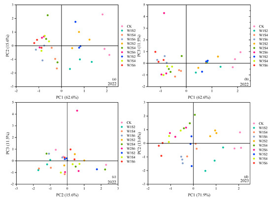 Composite plot of principal component scores in 2022 and 2023. (a) The scores of each treatment in 2022 on principal component 1 and principal component 2. (b) The scores of each treatment in 2022 on principal component 1 and principal component 3. (c) The scores of each treatment in 2022 on principal component 2 and principal component 3. (d) The scores of each treatment in 2023 on principal component 1 and principal component 2.