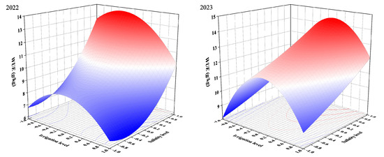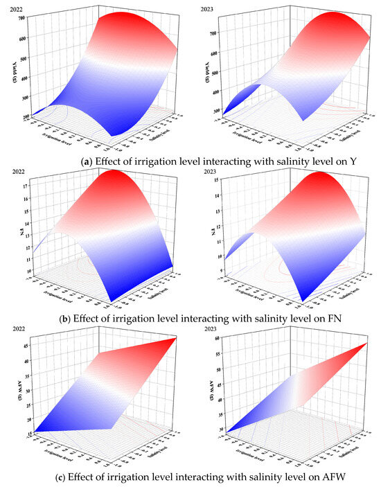 Figure 7 showed a strong degree of curvature of three-dimensional surfaces. WUE increased with the decrease in salinity level. WUE initially increased and subsequently decreased with the increase in irrigation level. This might be due to crop-stabilized yield under mild deficit irrigation and mild salt stress by reducing water evaporation [74], which was supported by the results in Figure 5a.