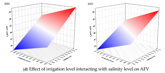 The RSM was used to study the combined effects of irrigation level and salinity level. The results are given in the form of 3D plots (Figure 5, Figure 6 and Figure 7). Meanwhile, the key information is summarized in Table 7.