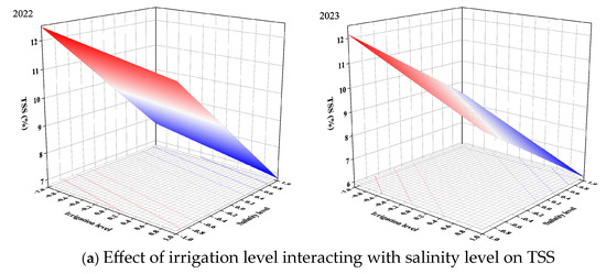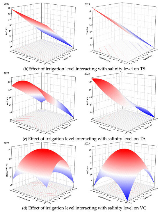 Many studies have shown that higher salinity levels increase the TSS and TS contents [72,73]. Our results also supported this result. The TSS and TS contents were linearly related to irrigation level and salinity level (Figure 6a,b). The TSS and TS contents increased with decreasing irrigation level and increasing salinity level. According to the results of the RSM, the TSS and TS contents reached their maximum when tomatoes were irrigated with the −1 irrigation level (55% FC) and the −1 salinity level (6 g/L). The TA content reached its highest level with the 0 irrigation level (70% FC) and −1 salinity level (6 g/L) in 2022, while the TA content reached its maximum value with the −1 irrigation level (55% FC) and −1 salinity level (6 g/L) in 2023 (Figure 6c). Though the response of TA to irrigation level was different in the two years, TA reached higher content at higher salinity levels. As can be seen in Figure 6d, mild deficit irrigation and the moderate salinity level were more conducive to obtaining a higher VC content. The VC content reached the maximum at the 0.09 irrigation level (71.35%) and −0.09 salinity level (3.82 g/L) in 2022. Meanwhile, the VC content reached the highest level at the −0.01 irrigation level (69.85%) and 0.02 salinity level (4.04 g/L) in 2023.