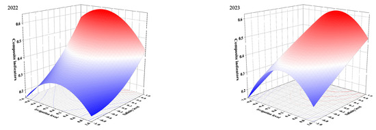 The composite response surface models based on the principal component–entropy weighting method in 2022 and 2023 were as follows: