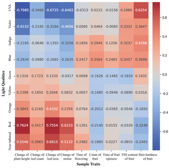 We analyzed the correlation between the collected large-scale trait data and light quality and plotted the correlation coefficients in a heat map as shown in Figure 1.