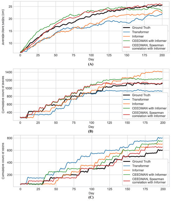 Prediction curves of comparative experiments. (A) The change of plant height: shown in the curves is the average plant height of the sample. (B) The change of leaf count: shown in the curves is the cumulative count of the leaves. (C) The change of stolons: shown in the curves is the cumulative count of the stolons.