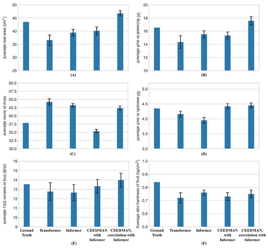 Prediction results of compared methods. (A) Average leaf area. (B) Average time of flowering. (C) Average count of fruits. (D) Average time of ripeness. (E) Average TSS content of fruit. (F) Average skin hardness of fruit.