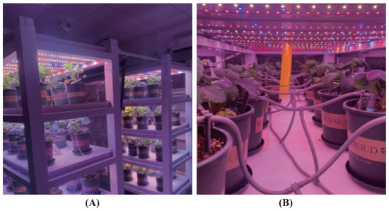 Cultivation and grouping of strawberry samples. (A) Sample incubation racks. (B) Lighting, irrigation, and grouping of samples.