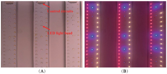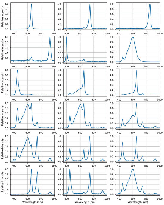 The illumination board in the experiment was designed and fabricated by us, and the lighting source was LED (JOMHYM, JH-STX3535, Dongguan, China). Multiple wavelengths of LEDs were soldered to the control circuit board to ensure random combination of light sources and uniformity of light illumination. The illumination board has seven single-source LEDs covering the UVA (350 nm) to near-infrared shortwave (1000 nm) range. In our experiments, we independently modulated the switching and intensity of each LED, resulting in varying combinations of total light quality. Furthermore, the regulation of lighting for different experimental groups was randomized, with alterations in light quality combinations occurring every 2 to 3 days. The LEDs worked 16 h a day (4:00 a.m. to 8:00 p.m.). This approach allowed ample time for the strawberry samples’ traits to evolve. We changed a total of 72 different combinations of light qualities and employed a portable spectrometer (StellarNet, BLK-CXR-SR, Tampa, FL, USA) to detect and record them throughout the experimentation process. The layout of the lighting board is depicted in Figure 5, and some light quality combinations are shown in Figure 6.