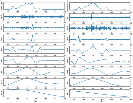 where R was the last residual value, and the IMF number was K. The last decomposition result was calculated by Equation (6). Finally, this method ensured proper signal decomposition and reconstruction.
