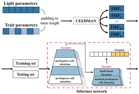 To comprehensively consider a broad spectrum and multiple traits, the problem of large amounts of data and the complex correlation between data needs to be solved. As far as we know, there are still no studies that utilize deep learning methods to consider the effects of light quality on plant traits from a broad-spectrum perspective. Thus, solutions based on neural networks have been introduced in this research. Informer was proposed [27], which was improved based on Transformer [28], to reduce computational complexity and avoid cumulative error diffusion when outputting long sequence data. Indeed, the Informer network’s architecture enables the incorporation of complex, time-series information regarding broad-spectrum changes into the model. It efficiently outputs changes in plant traits over the medium-to-long term in a single pass. Since trait predictions at each moment are influenced by the preceding moment, the Informer network, with its reduced cumulative error diffusion, is highly suitable for this study. This design ensures accurate and reliable predictions of plant traits, making it well-suited for the analysis of light quality effects on plants in a comprehensive manner. For example, Lu et al. [29] combined reinforcement learning with Informer to predict the fruit and stolon harvest of strawberry and to provide real-time feedback on the optimal growth environment. Wu et al. [30] utilized the Informer network model to make a prediction of photovoltaic power by taking complex weather variability factors into account. However, Informer-related models are still not applied much in agriculture, and their modeling advantages need to be exploited urgently.