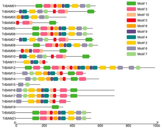 BAM is a multi-gene family found in several different plant species. Arabidopsis thaliana has nine BAM genes in its genome, rice has four BAM genes, and barley has nine BAM genes [39,40,41]. In horticultural crops, BAM has also been identified in some species such as 29 BAM genes in the banana genome and 19 BAM genes in grapes [42,43]. In this study, using bioinformatic methods, 21 members of the TrBAM gene family were identified in white clover. Compared with Arabidopsis (nine members), the BAM gene family in white clover has expanded [17,44]. By analyzing the evolutionary relationship between TrBAMs and AtBAMs, we found that white clover is closely related to Arabidopsis, which is consistent with the fact that both white clover and Arabidopsis are dicotyledonous plants.