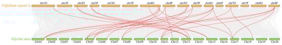 Synteny analyses of BAMs between white clover and soybean. The collinear gene pairs with TrBAMs are highlighted through the red lines, while the collinear blocks are marked through gray lines.