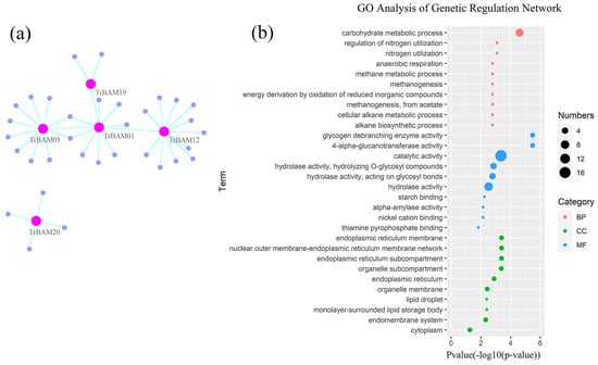 Gene regulatory network and gene ontology enrichment analysis of TrBAMs. (a) Gene regulatory network analysis of TrBAMs and their interactions in white clover. The gene regulatory network (GRN) of TrBAMs and their interactions were generated based on Arabidopsis interactions, which were displayed with Cytoscape software (version 3.9.1). Pink nodes correspond to TrBAMs, while violet nodes correspond to the genes that interacted with TrBAMs, the cyan lines represent interactions in white clover; (b) gene ontology enrichment analysis of interaction genes with TrBAMs. The GO enrichment analysis showed the involvement of interaction genes with TrBAMs in biological processes, molecular functions, and cellular components. Red dots represent GO terms from a biological process (BP), green dots represent GO terms from molecular function (CC), while blue dots represent GO terms from a cellular component (MF). Dot size represents the number of genes involving the GO term, the X-axis represents the p-value of topGO enrichment analysis, with −log10 transformation, −log10 (p), while the Y-axis represents GO terms.