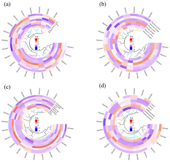 The expressional profiles of TrBAMs under various tissues and stresses. The details of the experiments are as follows: (a) Cold stress: RNA-seq database accession numbers of PRJNA781064. Eight time points were examined under cold stress as follows: 0 h, 30 min, 1 h, 3 h, 6 h, 12 h, 24 h, and 72 h, with three biological replications at each time point. (b) Drought stress: RNA-seq database accession numbers of PRJNA953427. Three white clover varieties—Minnesota, Florida, and Missouri—were studied under drought stress, with three biological replications for each variety. (c) Tissue-specific expression: RNA-seq database accession numbers of PRJNA523044. Eight tissues of white clover were analyzed, including emerging leaf, internode, leaf, mature leaf, nodal root, open florets, root, and stolon. Each tissue type was replicated three times. (d) Dodder parasitism: RNA-seq database accession numbers of PRJNA828029. White clover plants were subjected to both control and dodder parasitism conditions, with three biological replications for each group. Mean expression levels (FPKM values) were measured using Salmon software (version 0.12.0) and they were displayed using the ggplots package of the R platform.