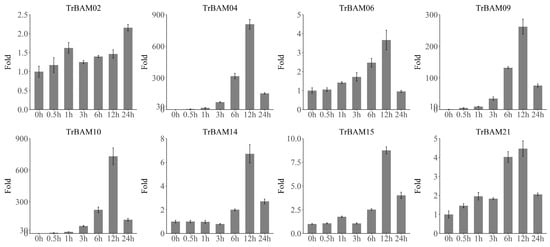 qRT-PCR analysis of TrBAMs in response to cold stress. The X-axis represents time points in response to cold stress and the Y-axis represents relative expression levels of TrBAM genes, which set the expression level at the “0 h” time point as 1. The expression levels were calculated using the 2−ΔΔCT method as the Section 5.8 describes.