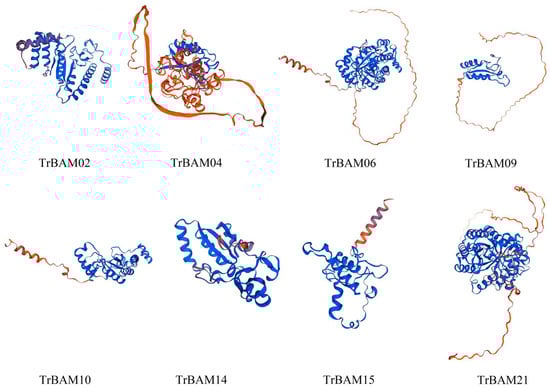 The secondary structure predictions of 21 TrBAM proteins revealed that they predominantly consisted of random coils (42.05–47.51%) followed by α-helices (39.22–40.35%), extended strands (12.90–22.78%), and β-turn structures (5.83–13.78%), as summarized in Table 1. Notably, no signal peptides or transmembrane regions were detected in any of the TrBAM proteins. Based on the prediction from SWISS-MODEL (https://swissmodel.expasy.org (accessed on 15 September 2023)), the protein tertiary structures of eight candidate TrBAM proteins were constructed (Figure 9). This structural analysis provides valuable insights into the composition and arrangement of secondary structures within TrBAM proteins, aiding in a deeper understanding of their functional characteristics.